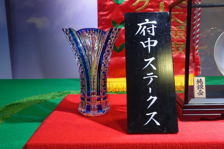 青葉賞のトロフィーです。ガラスの中に馬が浮いて見える素敵なトロフィーです。